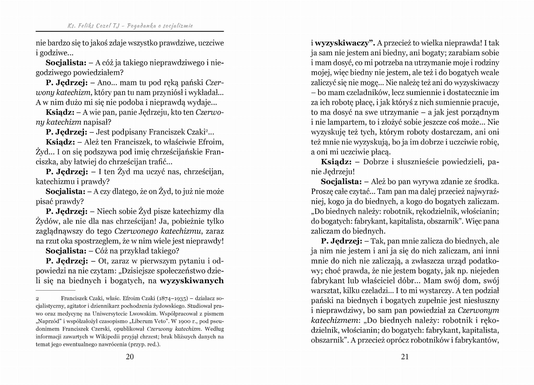 W książce Pogadanka o socjalizmie ksiądz Feliks Cozel w bardzo przystępny sposób rozprawia się z kłamstwami Żyda Czakiego, ukrywającego się, aby nie wzbudzać podejrzeń, pod pseudonimem Franciszek Czerski. Napisał on Czerwony katechizm, który miał wzbudzić u robotników zawiść wobec „wyzyskiwaczy” i przekonać ich, że powszechna idea równości socjalistycznej jest możliwa.