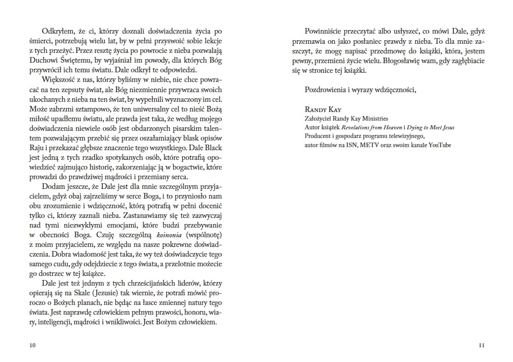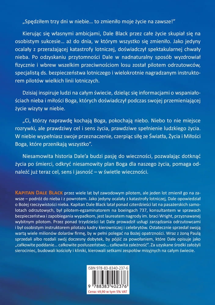 „Spędziłem trzy dni w niebie… to zmieniło moje życie na zawsze!” Kierując się własnymi ambicjami, Dale Black przez całe życie skupiał się na osobistym sukcesie… aż do dnia, w którym wszystko się zmieniło. Jako jedyny ocalały z przerażającej katastrofy lotniczej, doświadczył spektakularnej chwały nieba. Po odzyskaniu przytomności Dale w nadnaturalny sposób wyzdrowiał fizycznie i wbrew wszelkim przeciwnościom losu został pilotem odrzutowców, specjalistą ds. bezpieczeństwa lotniczego i wielokrotnie nagradzanym instruktorem pilotów wielkich linii lotniczych. Dzisiaj inspiruje ludzi na całym świecie, dzieląc się informacjami o wspaniałościach nieba i miłości Boga, których doświadczył podczas swojej przemieniającej życie wizyty w niebie.