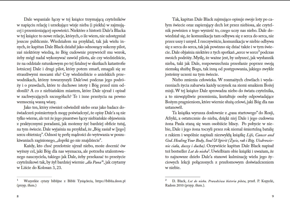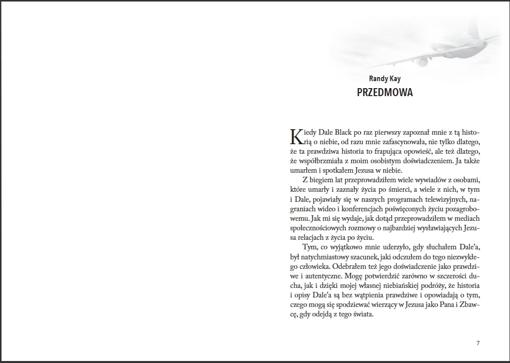 Kapitan Dale Black przez wiele lat był zawodowym pilotem, ale jeden lot zmienił go na zawsze – podróż do nieba i z powrotem. Jako jedyny ocalały z katastrofy lotniczej, Dale opowiedział o Bożej rzeczywistości nieba. Kapitan Dale Black latał ponad czterdzieści lat na pasażerskich samolotach odrzutowych, był pilotem-egzaminatorem na boeingach 737, konsultantem w sprawach bezpieczeństwa i zapobiegania wypadkom, jest laureatem nagrody im. braci Wright, przyznawanej wybitnym pilotom. Przez ponad trzydzieści lat Dale prowadził usługi zarządzania odrzutowcami i był osobistym instruktorem pilotażu kadry kierowniczej i celebrytów. Ostatecznie sprzedał swoją wartą wiele milionów dolarów firmę, by w pełni polegać na Bożej opatrzności. Wraz z żoną Paulą sprzedali albo rozdali swój doczesny dobytek, by pójść za powołaniem, które Dale opisuje jako „całkowite poddanie… całkowite posłuszeństwo… całkowita zależność”. Za uzyskane środki założyli sierociniec, budowali kościoły i kliniki, kierowali setkami zespołów misyjnych na całym świecie.